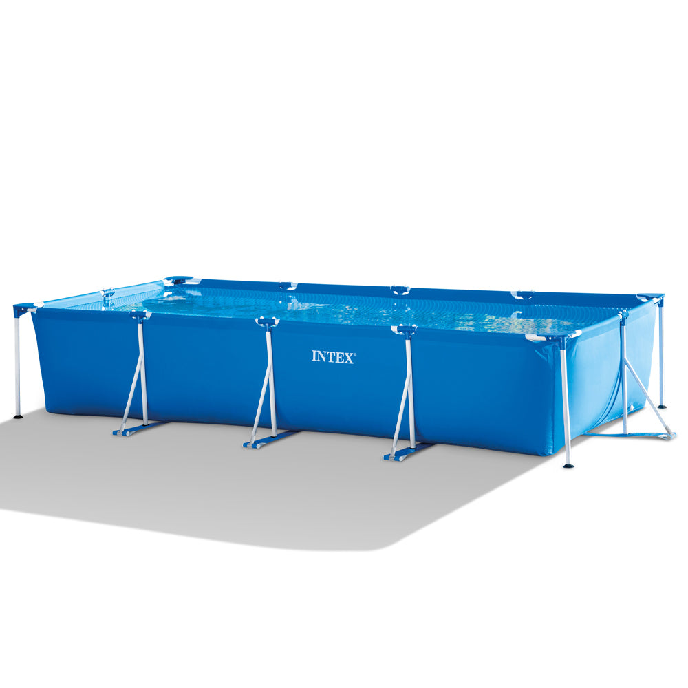 Piscina Metal Frame rectangular INTEX, medidas 450x220x84 cm y capacidad de 7.127 litros, con conexiones de Ø32 mm para filtros con tubos del mismo diámetro.