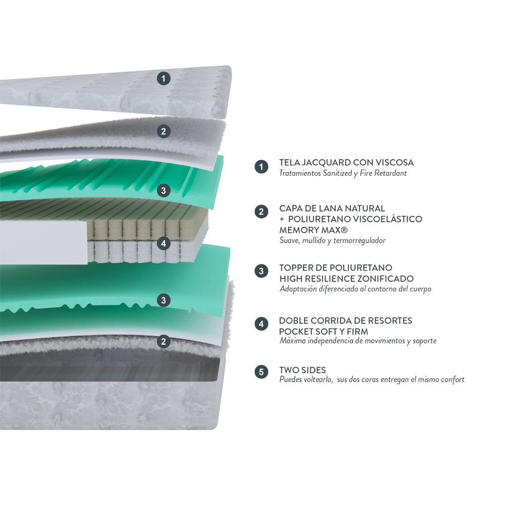 Colchón con tecnología premium, inspirada en el confort de la hotelería boutique. Adaptación perfecta y diseño superior con doble parrilla de resortes. Cubierta con lana termorreguladora y viscoelástica que disminuye los puntos de presión del cuerpo; además, es suave, fresca y de gran duración.