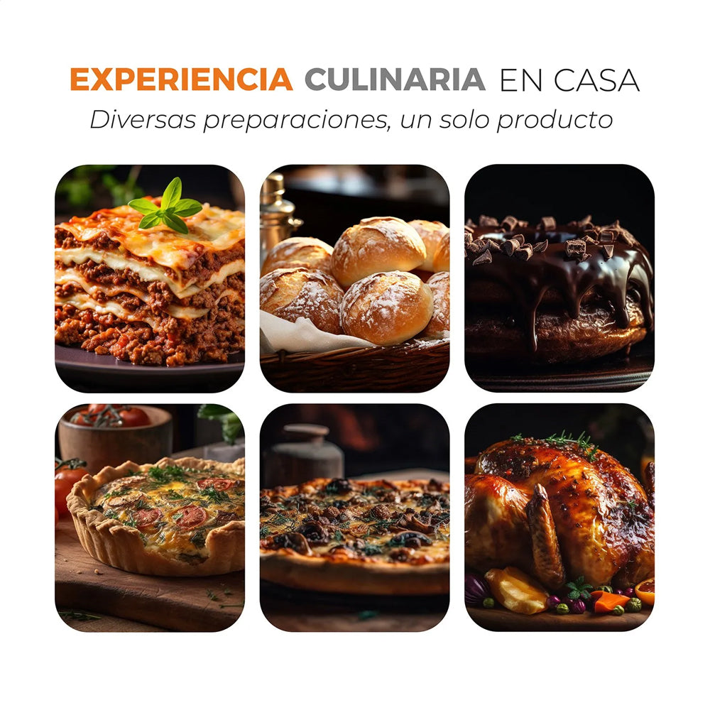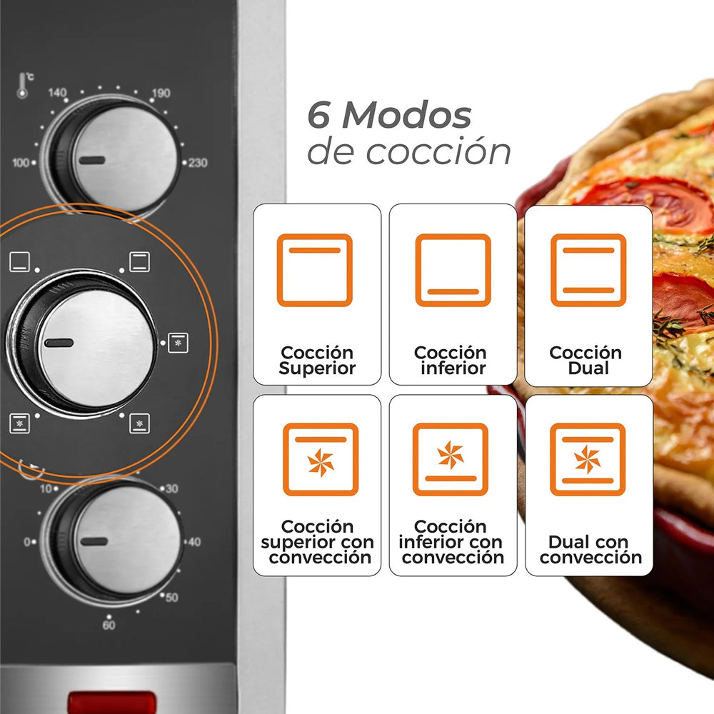 Descubre el Horno Eléctrico 45L Silver Series de Kitchen-it, perfecto para preparar deliciosos platillos en casa. Con una gran capacidad de 45 litros y un ventilador de convección, este horno alcanza hasta 230°C para una cocción rápida y uniforme. Su interior antiadherente y fácil de limpiar, junto con su revestimiento de acero inoxidable, garantiza durabilidad y comodidad en el uso diario. Disfruta de 6 modos de cocción que te permiten asar, hornear y tostar con facilidad. Cocina lo que quieras con resultados perfectos en cada uso.