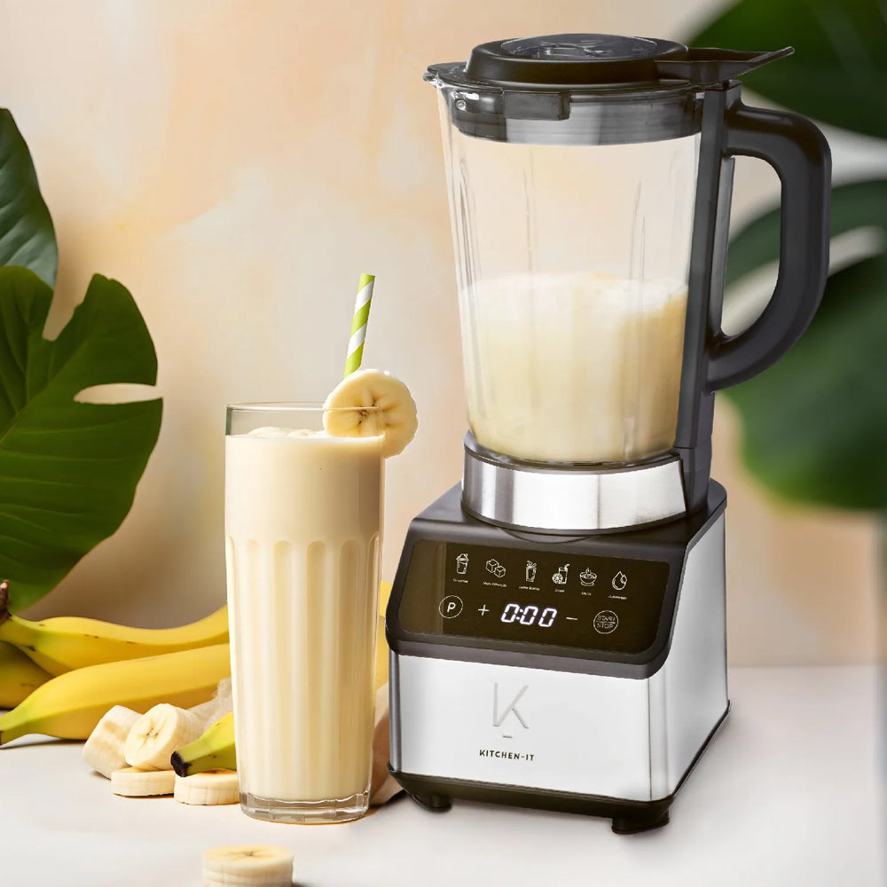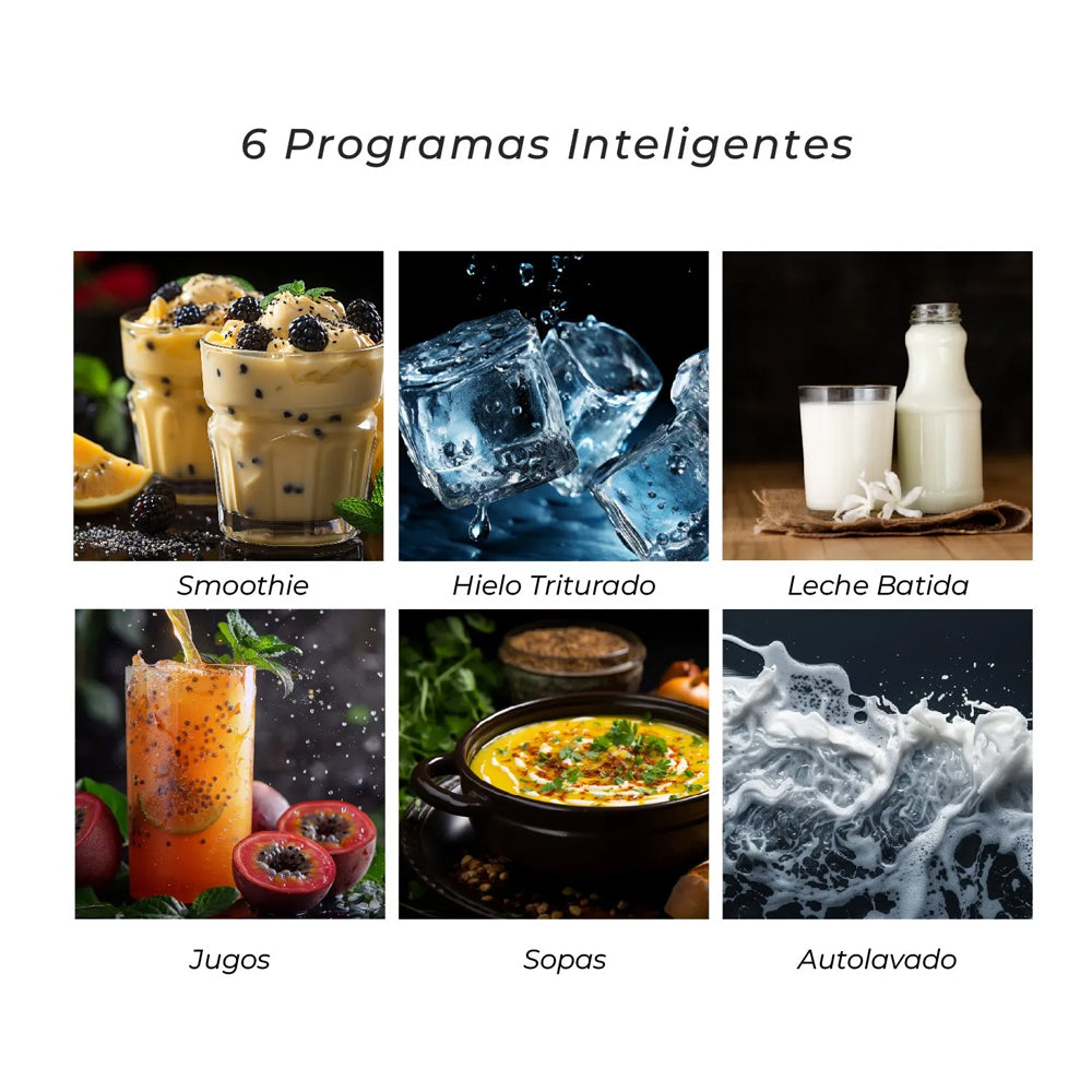 Con 1200W de potencia, 10 velocidades y 6 programas inteligentes que garantizan resultados rápidos y perfectos con solo presionar un botón. La Licuadora Smart Systems Kitchen-It ofrece resultados perfectos al instante. Su jarra de vidrio de 1.5 litros y sus cuchillas de alta precisión garantizan mezclas uniformes, mientras la tecnología Smart Lock asegura un uso seguro y sin derrames. Versatilidad y eficiencia en cada preparación.