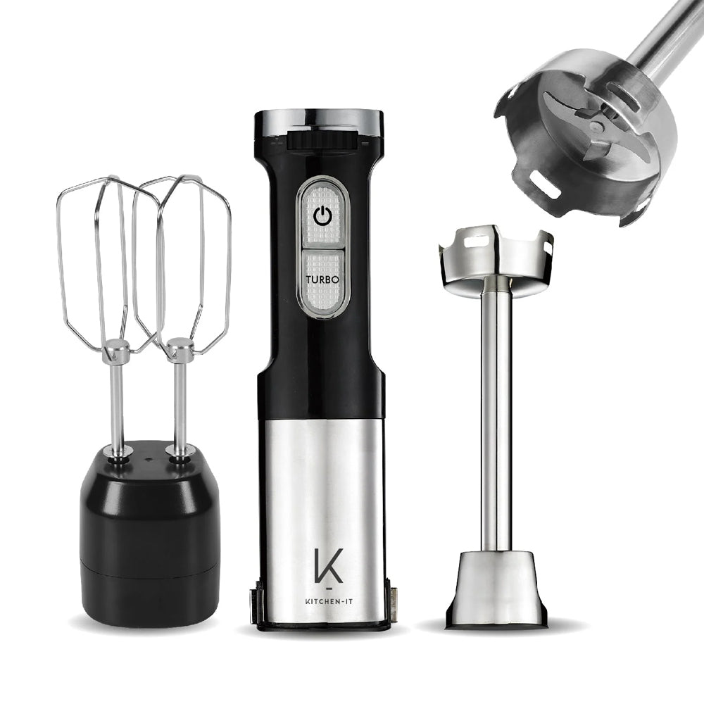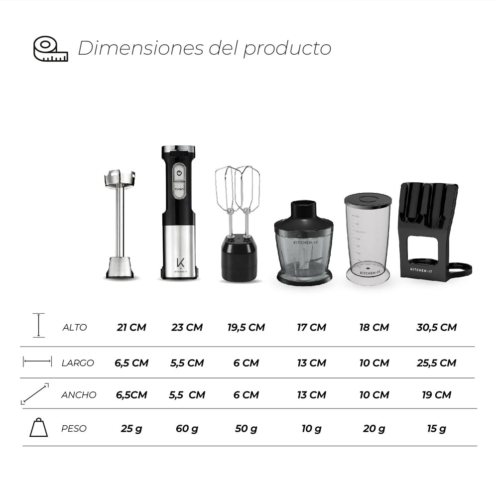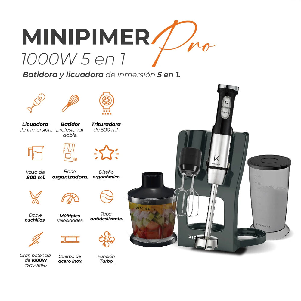 La Minipimer Pro 1000W 5 en 1 de Kitchen-It es la herramienta definitiva para tu cocina: con un potente motor de 1000W, función Turbo y cuchillas dobles de acero inoxidable, permite batir, picar, triturar, mezclar y emulsionar con total precisión. Incluye batidoras dobles, picadora, brazo triturador, vaso medidor de 800 ml y base organizadora, todo en un diseño robusto y elegante. Ideal para preparar cremas, salsas, hummus, carnes, merengues y mucho más, todo sin cambiar de aparato.