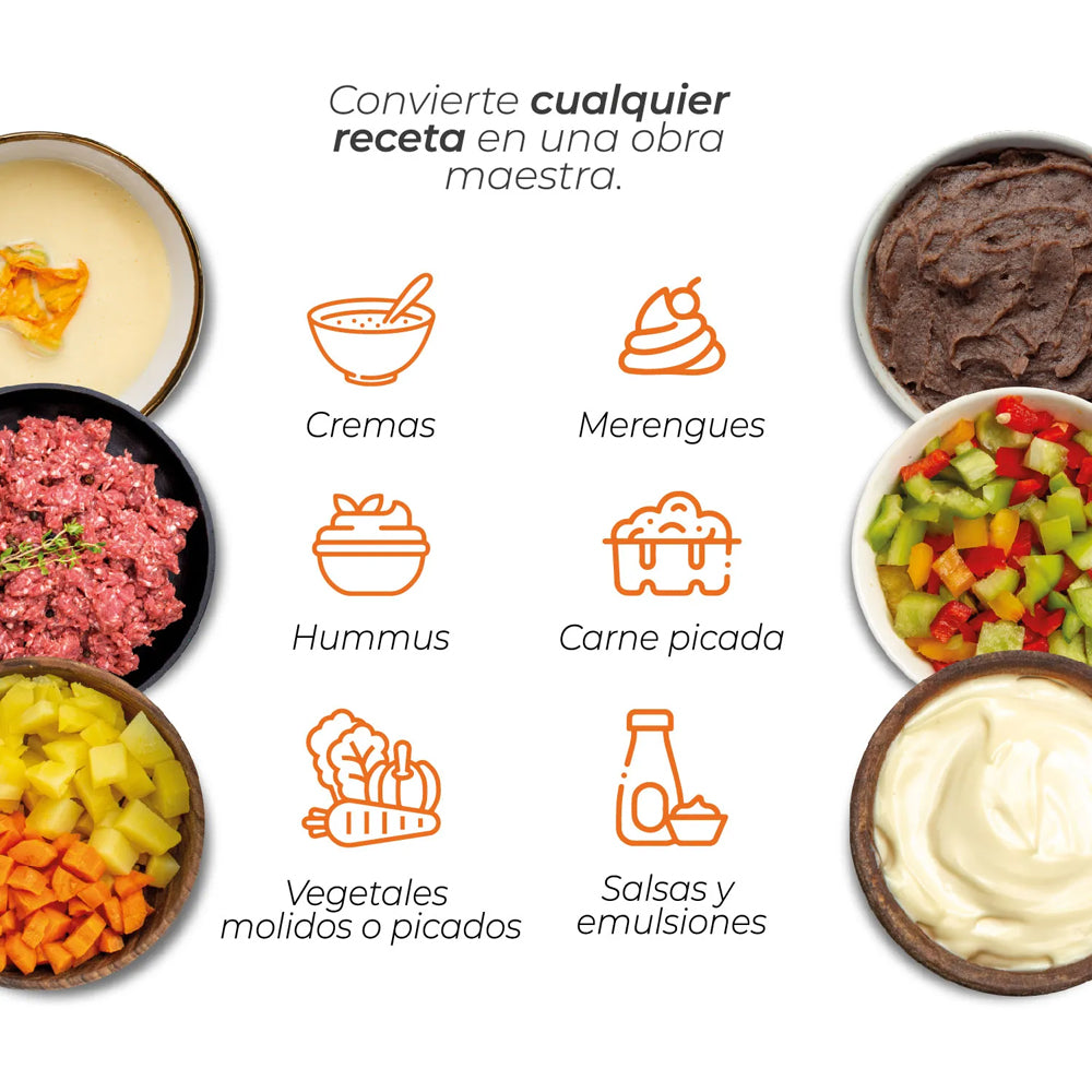 La Minipimer Lite 600W 4 en 1 es la herramienta imprescindible para quienes desean rapidez, practicidad y múltiples funciones en un solo electrodoméstico. Con su potente motor y accesorios intercambiables, podrás batir, triturar, mezclar y medir sin esfuerzo. Incluye vaso medidor de 800 ml, picadora de 500 ml, batidor de varillas y cabezal mezclador con doble cuchilla. Ideal para preparar desde purés y cremas hasta salsas, merengues o carne picada. Compacta, versátil y fácil de limpiar, es tu aliada perfecta para cocinar de forma más ágil todos los días.